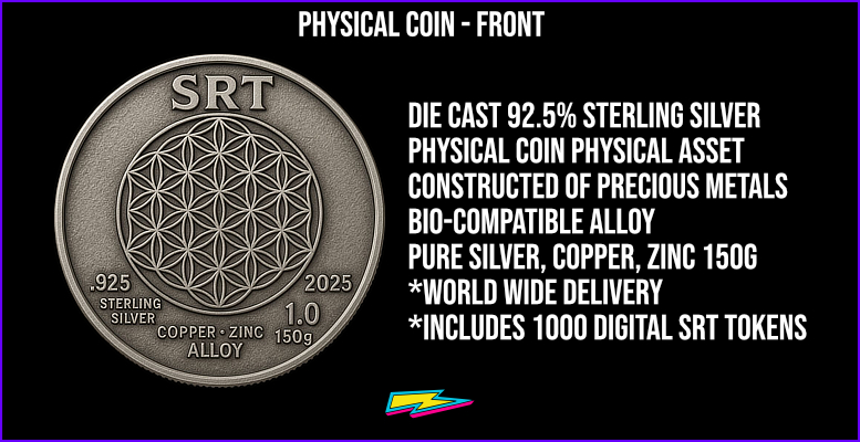 The official SRT Collector Coin is a 92.5% Sterling Silver laser-engraved physical coin containing a unique QR code linked to your SRT token certificate. Each coin is serialized and individually verifiable.